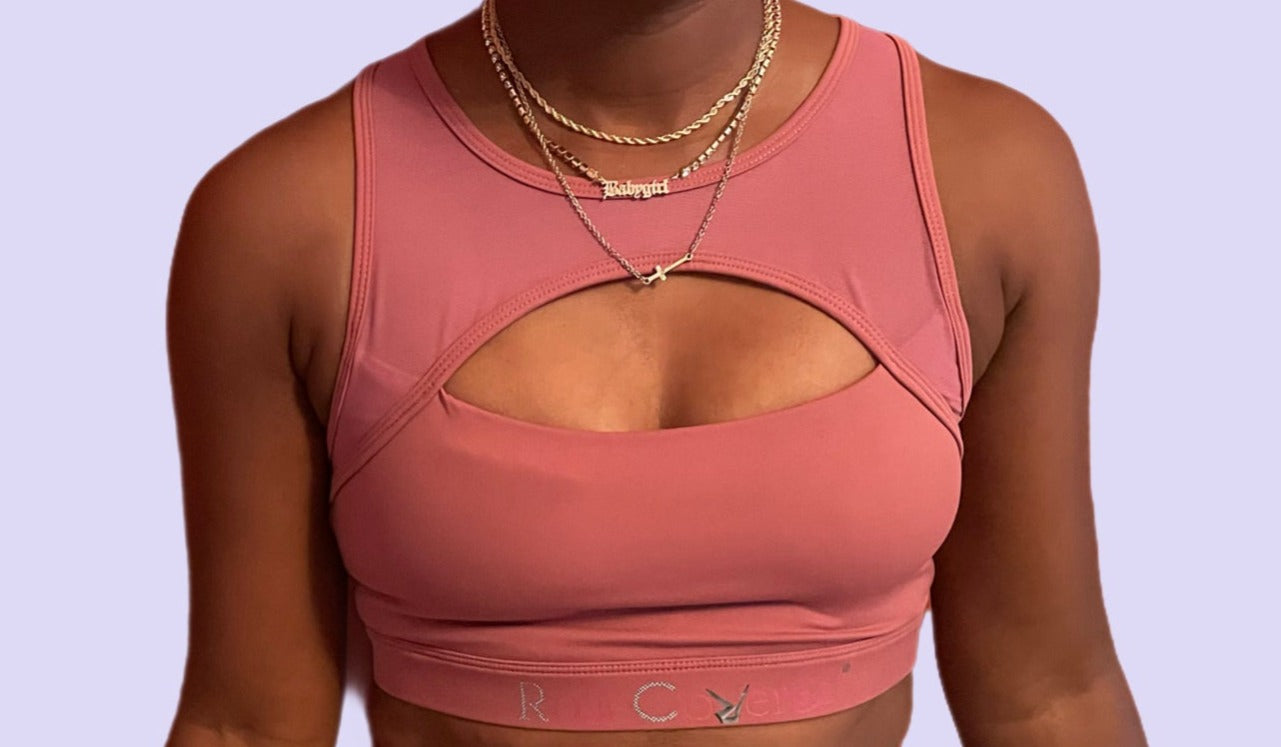 RoseCoveredFIT™ athleisure line provide soft and skin-friendly fabric, four-way stretch sports bra with vest-type straps. The front contains see-through tulle straps to add an element of sexy while you work out. There is an 1.1 inch hemline to prevent rolling edges. with removable chest pads.